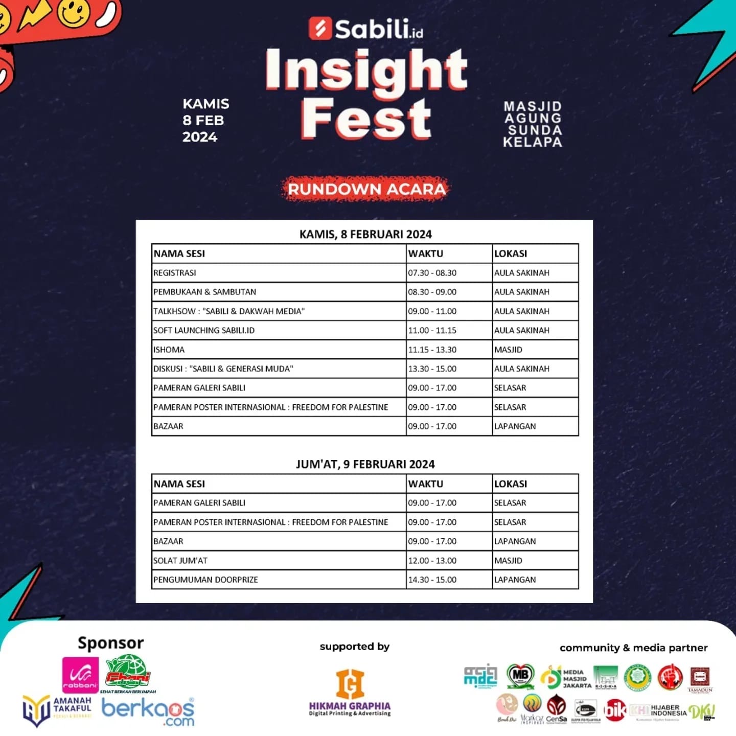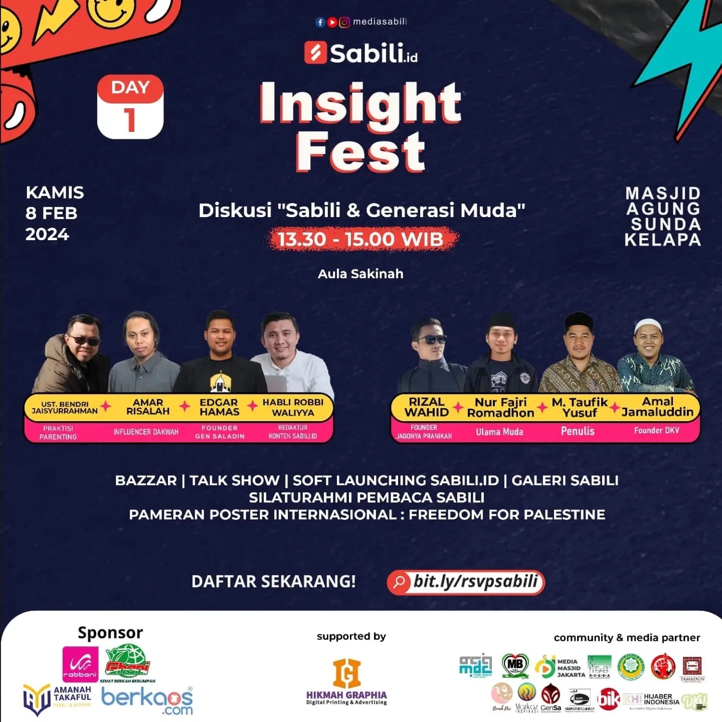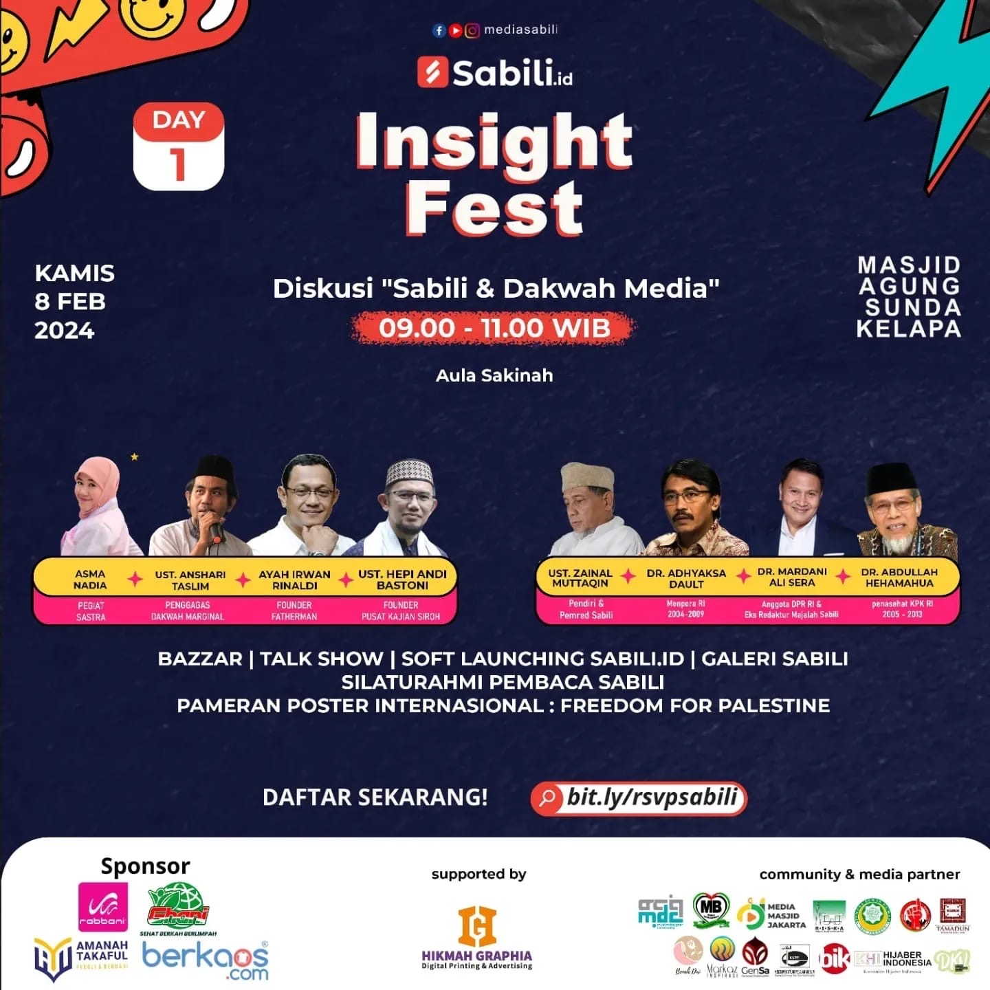 Assalamu’alaikum warahmatullahi wabarakatuh. Jamaah Masjid Agung Sunda Kelapa sekalian, sudah tahu belum kalo di tanggal 8-9 Febuari 2024 bakal ada acara seru? Yaitu “Insight Fest : Diskusi Sabili & Dakwah Media”. Sabili sendiri adalah sebuah majalah Islam yang pernah terbit di Indonesia dan peresmiannya diadakan di Masjid Agung Sunda Kelapa. Kini Majalah Sabili telah bertransformasi menjadi media digital dengan alamat sabili.id.