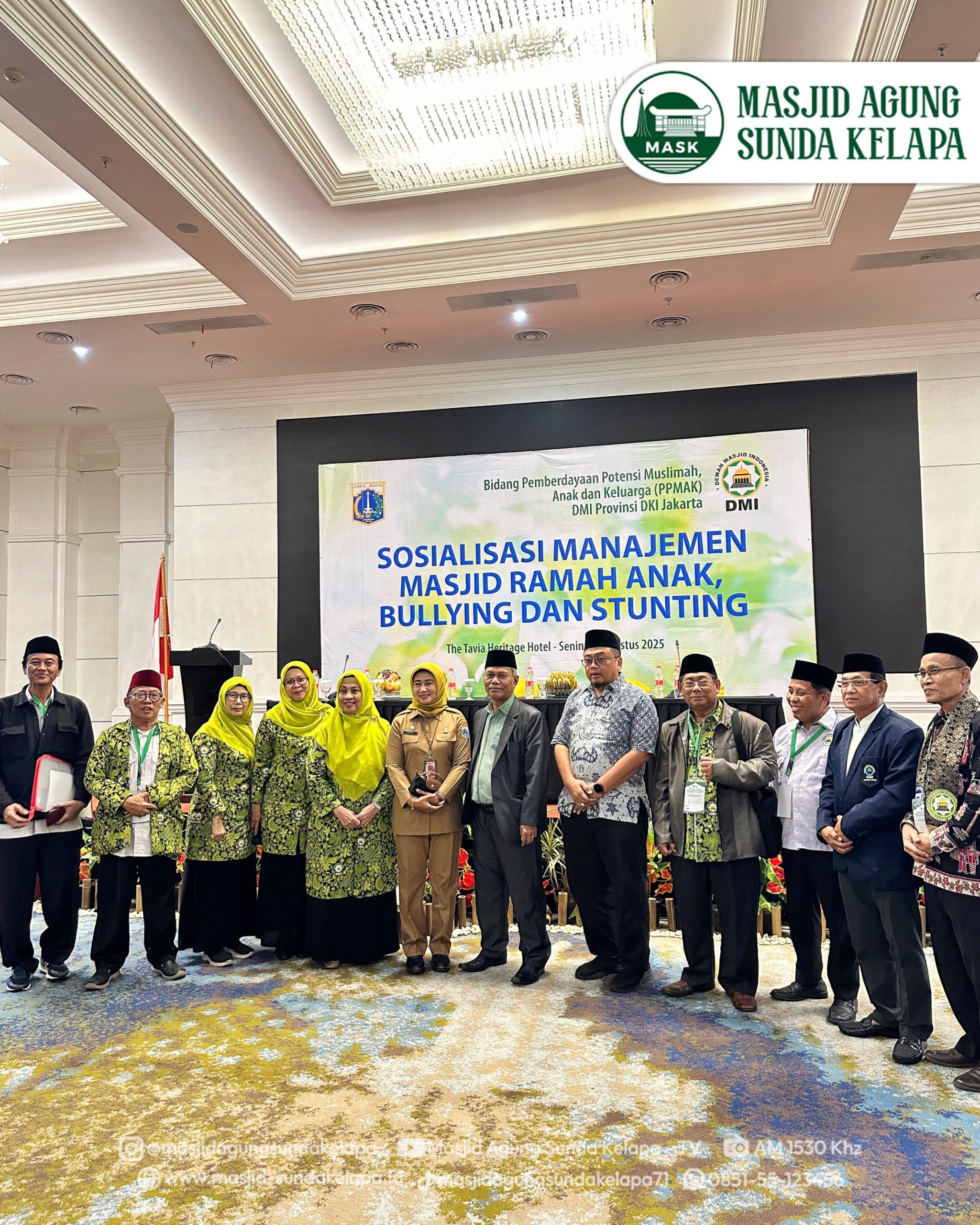 - Jakarta, 25 Agustus 2025 – Dewan Masjid Indonesia (DMI) Provinsi Jakarta bersama Dinas Pemberdayaan, Perlindungan Anak, dan Pengendalian Penduduk (PPAPP) Provinsi DKI Jakarta menggelar Sosialisasi Masjid Ramah Anak, Bullying, dan Stunting pada Senin (25/8) di The Tavia Heritage Hotel, Jakarta.