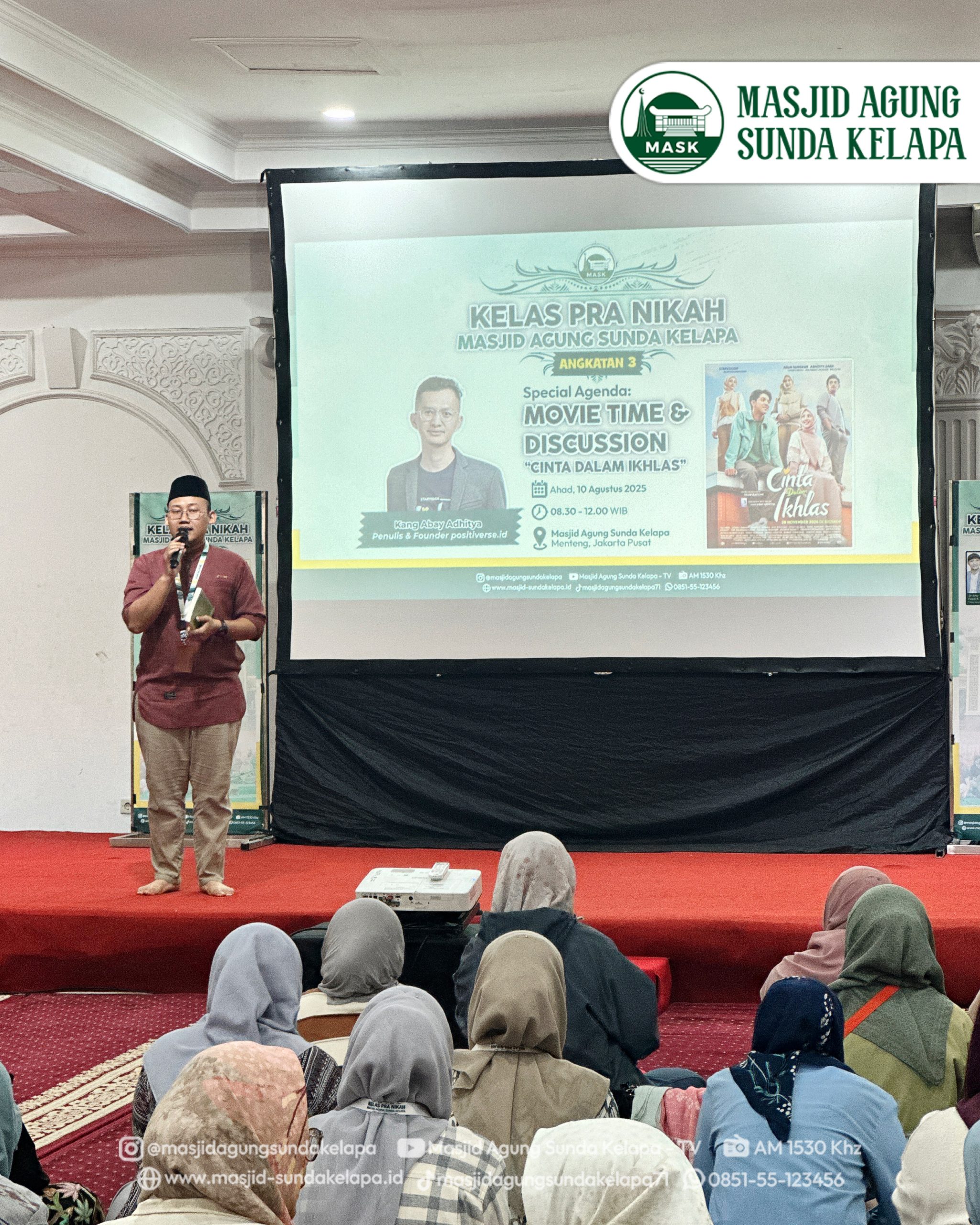Jakarta, 10 Agustus 2025 – Masjid Agung Sunda Kelapa (MASK) kembali menghadirkan agenda istimewa dalam rangkaian Kelas Pra Nikah Angkatan 3 dengan menggelar special agenda bertajuk “Movie Time & Discussion”. Kegiatan yang dilaksanakan pada Ahad, 10 Agustus 2025, pukul 08.30–12.00 WIB ini menghadirkan penulis sekaligus narasumber utama, Kang Abay, dengan membahas karyanya yang berjudul “Cinta Dalam Ikhlas”.